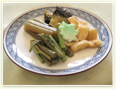 - お皿に5品になるように、1の蕨、油揚げ、焚いた鰊と、2の蕗を盛って、生麩を飾る。