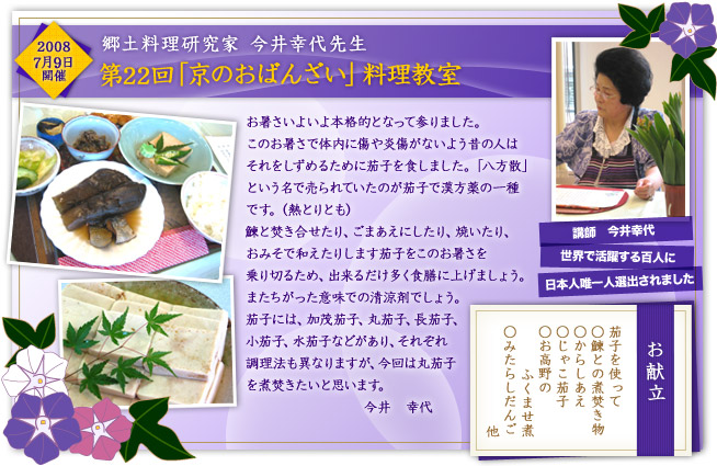 今井先生の手作りのぬか漬けと、先月教わったキャベツのサラダがさっぱりとして暑い毎日に食欲を刺激します。
